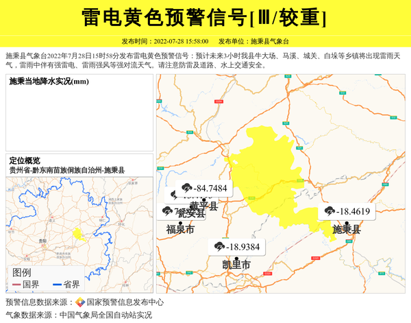 施秉县气象台2022年7月28日15时58分发布雷电黄色预警信号:预计未来3小时我县牛大场、马溪、城关、白垛等乡镇将出现雷雨天气,雷雨中伴有强雷电、雷雨强风等强对流天气。请注意防雷及道路、水上交通安全。 信息来源:国家预警信息发布中心; 发布单位:施秉县气象台。