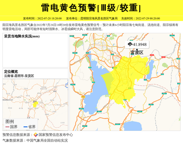 阳宗海风景名胜区气象台2022年7月28日18时20分发布雷电黄色预警信号:预计未来6小时阳宗海七甸街道、汤池街道、阳宗镇将有明显雷电活动,局部可能伴有短时强降水、冰雹或瞬时大风,请注意防范。 信息来源:国家预警信息发布中心; 发布单位:昆明阳宗海风景名胜区气象局。