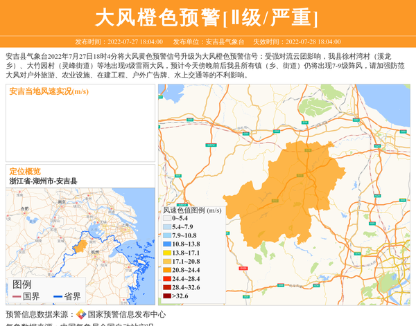 安吉县气象台2022年7月27日18时4分将大风黄色预警信号升级为大风橙色预警信号:受强对流云团影响,我县徐村湾村(溪龙乡)、大竹园村(灵峰街道)等地出现9级雷雨大风,预计今天傍晚前后我县所有镇(乡、街道)仍将出现7-9级阵风,请加强防范大风对户外旅游、农业设施、在建工程、户外广告牌、水上交通等的不利影响。 信息来源:国家预警信息发布中心; 发布单位:安吉县气象台。
