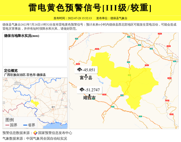 德保县气象台2022年7月28日15时52分发布雷电黄色预警信号:预计未来6小时内德保县西北部地区可能发生雷电活动,可能会造成雷电灾害事故,并伴有短时强降水和大风,请做好防范。 信息来源:国家预警信息发布中心; 发布单位:德保县气象台。