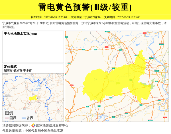 宁乡市气象台2022年7月28日12时25分发布雷电黄色预警信号:预计宁乡市未来6小时将发生雷电活动,可能出现雷电灾害事故,请加强防范。 信息来源:国家预警信息发布中心; 发布单位:宁乡市气象局。