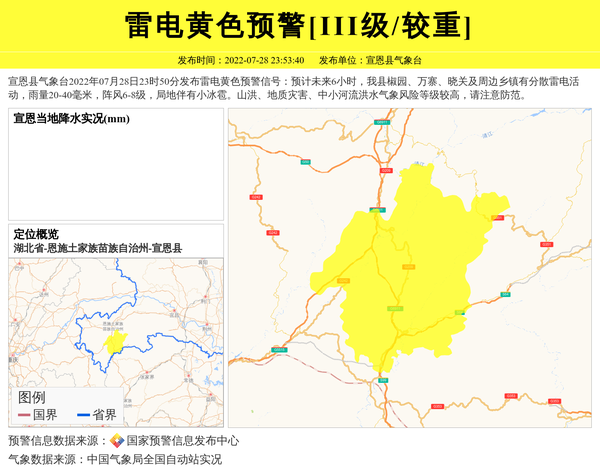 宣恩县气象台2022年07月28日23时50分发布雷电黄色预警信号:预计未来6小时,我县椒园、万寨、晓关及周边乡镇有分散雷电活动,雨量20-40毫米,阵风6-8级,局地伴有小冰雹。山洪、地质灾害、中小河流洪水气象风险等级较高,请注意防范。 信息来源:国家预警信息发布中心; 发布单位:宣恩县气象台。
