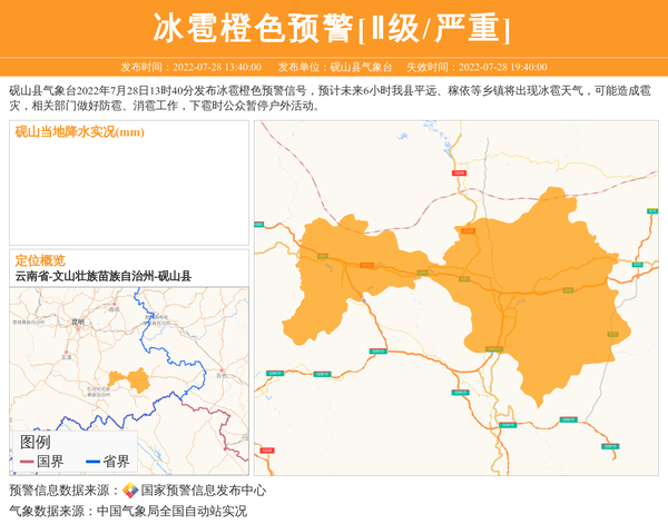砚山县气象台2022年7月28日13时40分发布冰雹橙色预警信号,预计未来6小时我县平远、稼依等乡镇将出现冰雹天气,可能造成雹灾,相关部门做好防雹、消雹工作,下雹时公众暂停户外活动。 信息来源:国家预警信息发布中心; 发布单位:砚山县气象台。