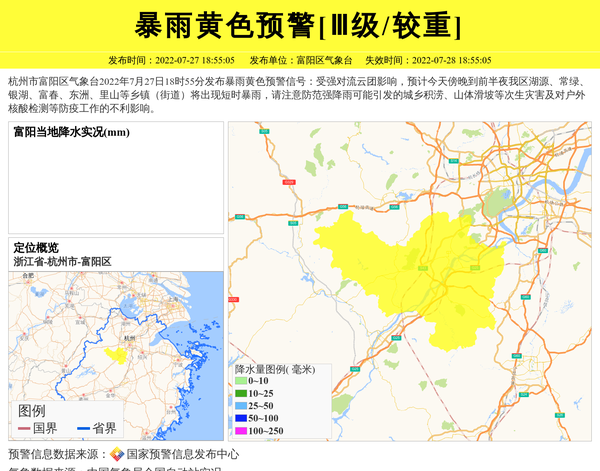 杭州市富阳区气象台2022年7月27日18时55分发布暴雨黄色预警信号:受强对流云团影响,预计今天傍晚到前半夜我区湖源、常绿、银湖、富春、东洲、里山等乡镇(街道)将出现短时暴雨,请注意防范强降雨可能引发的城乡积涝、山体滑坡等次生灾害及对户外核酸检测等防疫工作的不利影响。 信息来源:国家预警信息发布中心; 发布单位:富阳区气象台。