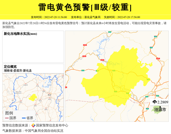 新化县气象台2022年7月28日11时56分发布雷电黄色预警信号:预计新化县未来6小时将发生雷电活动,可能出现雷电灾害事故,请加强防范。 信息来源:国家预警信息发布中心; 发布单位:新化县气象局。