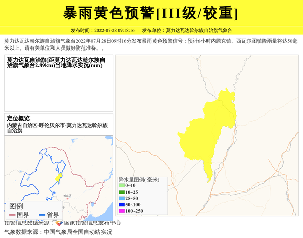莫力达瓦达斡尔族自治旗气象台2022年07月28日09时16分发布暴雨黄色预警信号:预计6小时内腾克镇、西瓦尔图镇降雨量将达50毫米以上。请有关单位和人员做好防范准备。。 信息来源:国家预警信息发布中心; 发布单位:莫力达瓦达斡尔族自治旗气象台。