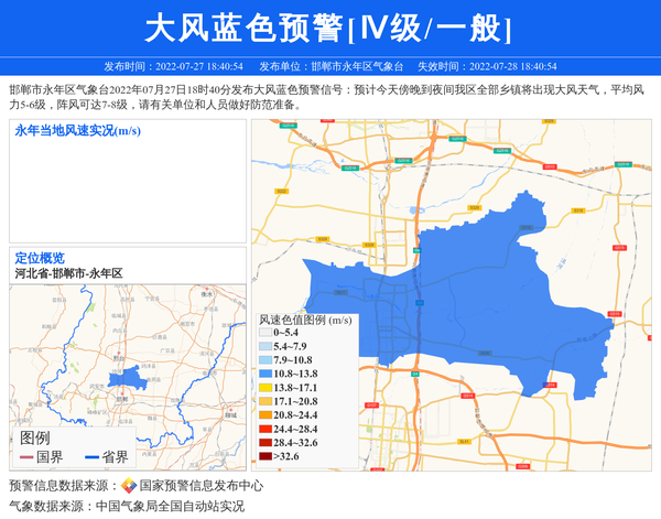 邯郸市永年区气象台2022年07月27日18时40分发布大风蓝色预警信号:预计今天傍晚到夜间我区全部乡镇将出现大风天气,平均风力5-6级,阵风可达7-8级,请有关单位和人员做好防范准备。 信息来源:国家预警信息发布中心; 发布单位:邯郸市永年区气象台。