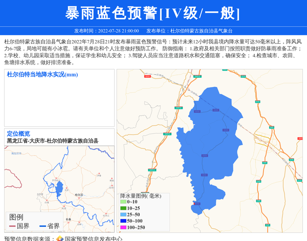 杜尔伯特蒙古族自治县气象台2022年7月28日21时发布暴雨蓝色预警信号:预计未来12小时我县境内降水量可达50毫米以上,阵风风力6-7级,局地可能有小冰雹。请有关单位和个人注意做好预防工作。防御指南: 1.政府及相关部门按照职责做好防暴雨准备工作; 2.学校、幼儿园采取适当措施,保证学生和幼儿安全; 3.驾驶人员应当注意道路积水和交通阻塞,确保安全; 4.检查城市、农田、鱼塘排水系统,做好排涝准备。 信息来源:国家预警信息发布中心; 发布单位:杜尔伯特蒙古族自治县气象台。