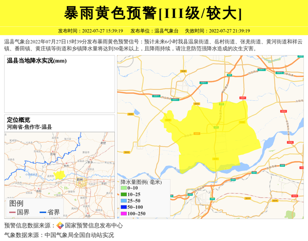 温县气象台2022年07月27日15时39分发布暴雨黄色预警信号:预计未来6小时我县温泉街道、岳村街道、张羌街道、黄河街道和祥云镇、番田镇、黄庄镇等街道和乡镇降水量将达到50毫米以上,且降雨持续,请注意防范强降水造成的次生灾害。 信息来源:国家预警信息发布中心; 发布单位:温县气象台。