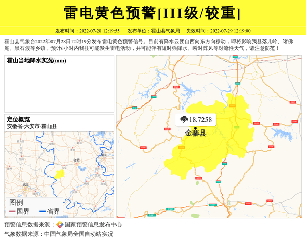霍山县气象台2022年07月28日12时19分发布雷电黄色预警信号。目前有降水云团自西向东方向移动,即将影响我县落儿岭、诸佛庵、黑石渡等乡镇,预计6小时内我县可能发生雷电活动,并可能伴有短时强降水、瞬时阵风等对流性天气,请注意防范! 信息来源:国家预警信息发布中心; 发布单位:霍山县气象局。