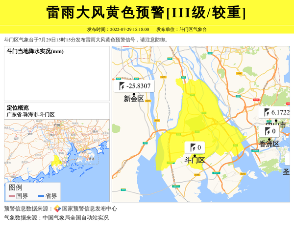 斗门区气象台于7月29日15时15分发布雷雨大风黄色预警信号,请注意防御。 信息来源:国家预警信息发布中心; 发布单位:斗门区气象台。