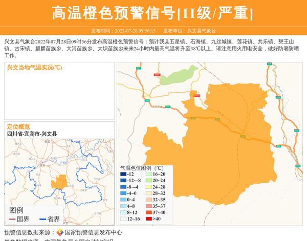 兴文县气象台2022年07月28日09时56分发布高温橙色预警信号:预计我县五星镇、石海镇、九丝城镇、莲花镇、共乐镇、僰王山镇、古宋镇、麒麟苗族乡、大河苗族乡、大坝苗族乡未来24小时内最高气温将升至38℃以上。请注意用火用电安全,做好防暑防晒工作。 信息来源:国家预警信息发布中心; 发布单位:兴文县气象台。