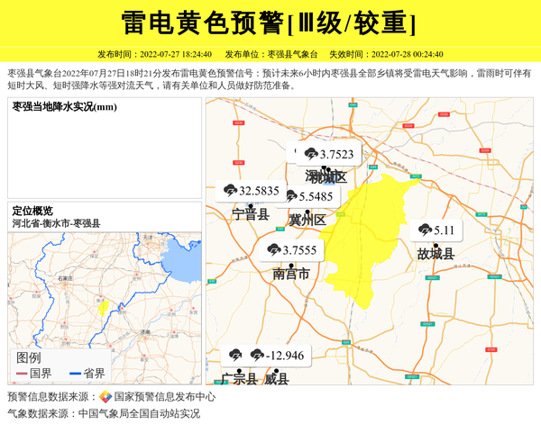 枣强县气象台2022年07月27日18时21分发布雷电黄色预警信号:预计未来6小时内枣强县全部乡镇将受雷电天气影响,雷雨时可伴有短时大风、短时强降水等强对流天气,请有关单位和人员做好防范准备。 信息来源:国家预警信息发布中心; 发布单位:枣强县气象台。