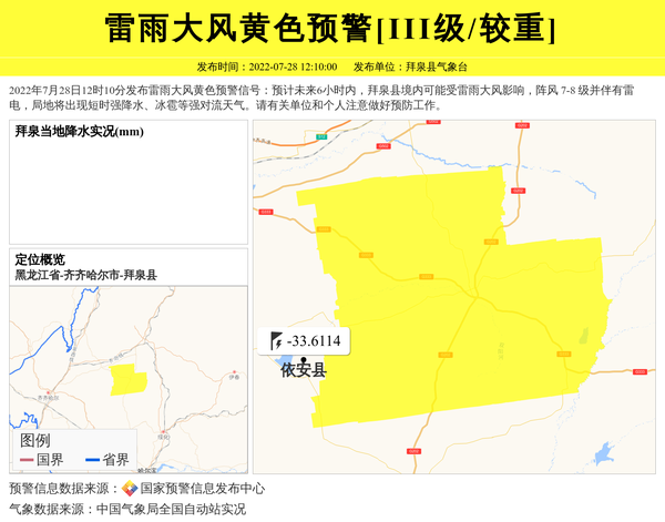2022年7月28日12时10分发布雷雨大风黄色预警信号:预计未来6小时内,拜泉县境内可能受雷雨大风影响,阵风 7-8 级并伴有雷电,局地将出现短时强降水、冰雹等强对流天气。请有关单位和个人注意做好预防工作。 信息来源:国家预警信息发布中心; 发布单位:拜泉县气象台。