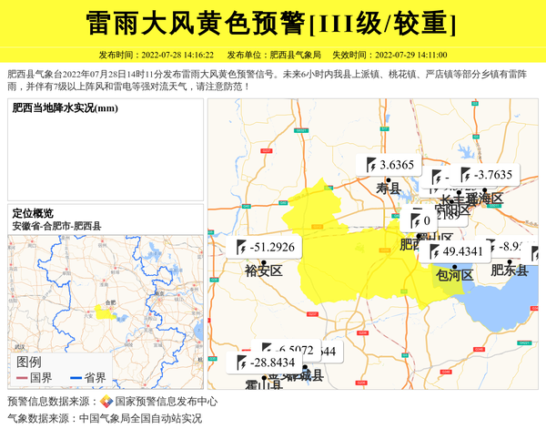 肥西县气象台2022年07月28日14时11分发布雷雨大风黄色预警信号。未来6小时内我县上派镇、桃花镇、严店镇等部分乡镇有雷阵雨,并伴有7级以上阵风和雷电等强对流天气,请注意防范! 信息来源:国家预警信息发布中心; 发布单位:肥西县气象局。