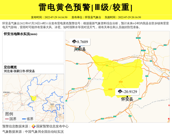 怀安县气象台2022年07月29日14时11分发布雷电黄色预警信号:根据最新气象资料综合分析,预计未来6小时内我县全部乡镇将受雷电天气影响,雷雨时可能伴有雷暴大风、冰雹、短时强降水等强对流天气,请有关单位和人员做好防范准备。 信息来源:国家预警信息发布中心; 发布单位:怀安县气象台。