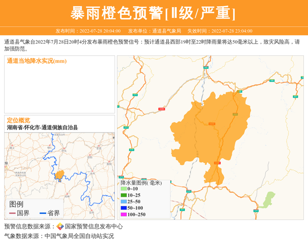 通道县气象台2022年7月28日20时4分发布暴雨橙色预警信号:预计通道县西部19时至22时降雨量将达50毫米以上,致灾风险高,请加强防范。 信息来源:国家预警信息发布中心; 发布单位:通道县气象局。