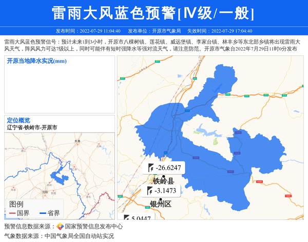 雷雨大风蓝色预警信号:预计未来1到3小时,开原市八棵树镇、莲花镇、威远堡镇、李家台镇、林丰乡等东北部乡镇将出现雷雨大风天气,阵风风力可达7级以上,同时可能伴有短时强降水等强对流天气,请注意防范。开原市气象台2022年7月29日11时0分发布 信息来源:国家预警信息发布中心; 发布单位:开原市气象局。