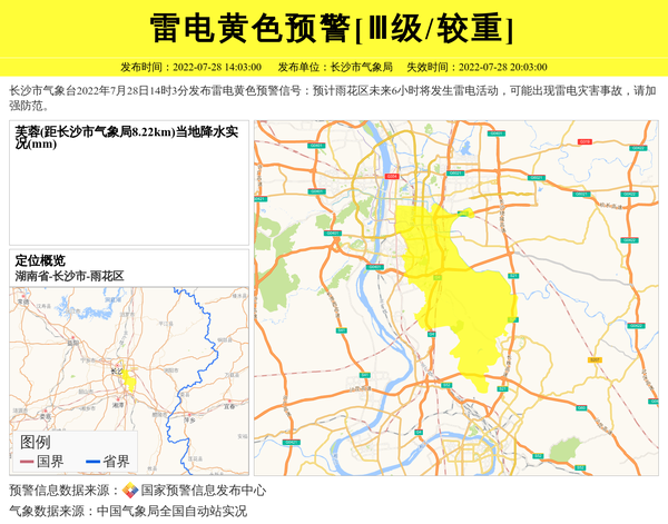 长沙市气象台2022年7月28日14时3分发布雷电黄色预警信号:预计雨花区未来6小时将发生雷电活动,可能出现雷电灾害事故,请加强防范。 信息来源:国家预警信息发布中心; 发布单位:长沙市气象局。