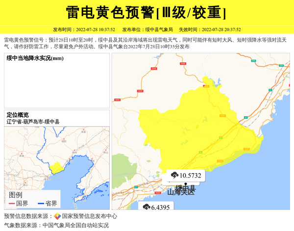 雷电黄色预警信号:预计28日10时至20时,绥中县及其沿岸海域将出现雷电天气,同时可能伴有短时大风、短时强降水等强对流天气,请作好防雷工作,尽量避免户外活动。绥中县气象台2022年7月28日10时35分发布 信息来源:国家预警信息发布中心; 发布单位:绥中县气象局。