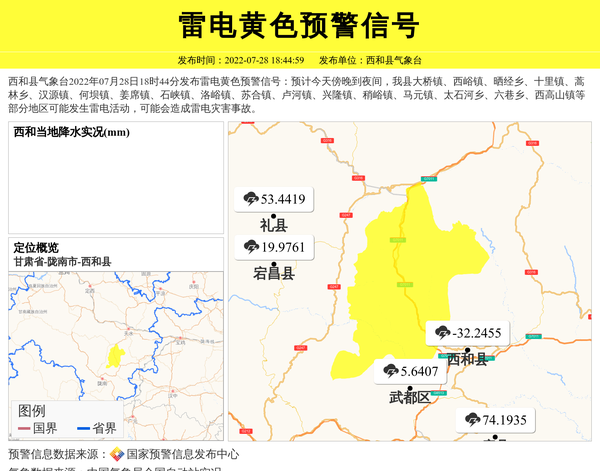 西和县气象台2022年07月28日18时44分发布雷电黄色预警信号:预计今天傍晚到夜间,我县大桥镇、西峪镇、晒经乡、十里镇、蒿林乡、汉源镇、何坝镇、姜席镇、石峡镇、洛峪镇、苏合镇、卢河镇、兴隆镇、稍峪镇、马元镇、太石河乡、六巷乡、西高山镇等部分地区可能发生雷电活动,可能会造成雷电灾害事故。 信息来源:国家预警信息发布中心; 发布单位:西和县气象台。