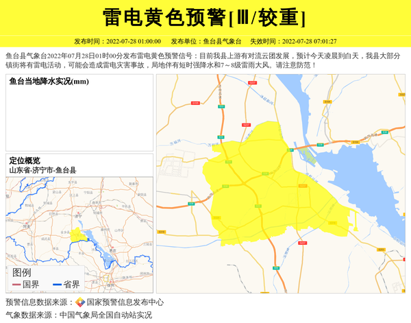 鱼台县气象台2022年07月28日01时00分发布雷电黄色预警信号:目前我县上游有对流云团发展,预计今天凌晨到白天,我县大部分镇街将有雷电活动,可能会造成雷电灾害事故,局地伴有短时强降水和7~8级雷雨大风。请注意防范! 信息来源:国家预警信息发布中心; 发布单位:鱼台县气象台。