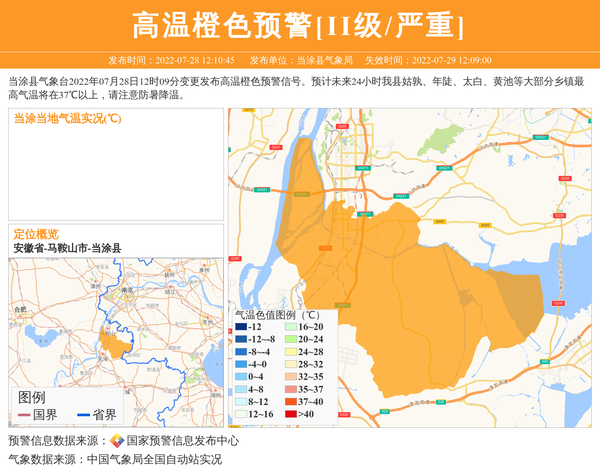 当涂县气象台2022年07月28日12时09分变更发布高温橙色预警信号。预计未来24小时我县姑孰、年陡、太白、黄池等大部分乡镇最高气温将在37℃以上,请注意防暑降温。 信息来源:国家预警信息发布中心; 发布单位:当涂县气象局。