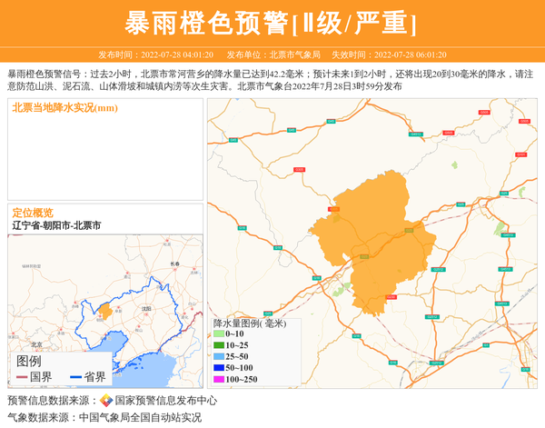 暴雨橙色预警信号:过去2小时,北票市常河营乡的降水量已达到42.2毫米;预计未来1到2小时,还将出现20到30毫米的降水,请注意防范山洪、泥石流、山体滑坡和城镇内涝等次生灾害。北票市气象台2022年7月28日3时59分发布 信息来源:国家预警信息发布中心; 发布单位:北票市气象局。