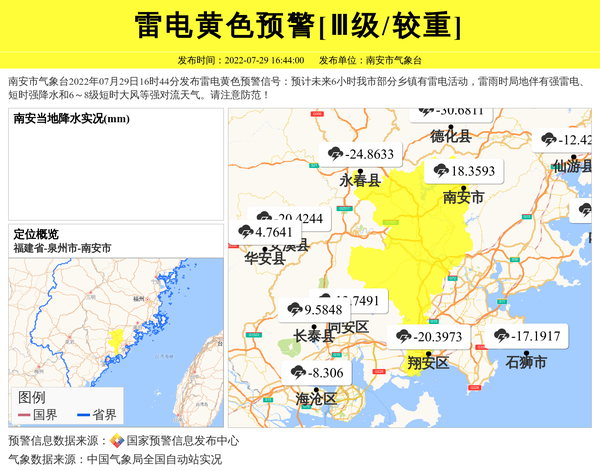 南安市气象台2022年07月29日16时44分发布雷电黄色预警信号:预计未来6小时我市部分乡镇有雷电活动,雷雨时局地伴有强雷电、短时强降水和6~8级短时大风等强对流天气。请注意防范! 信息来源:国家预警信息发布中心; 发布单位:南安市气象台。
