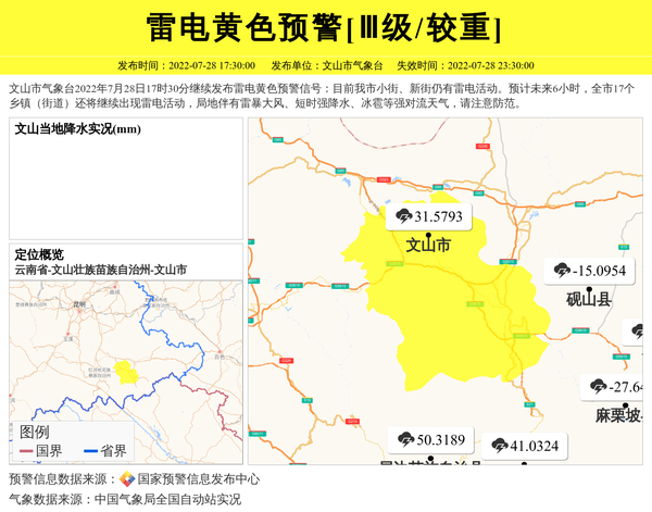 文山市气象台2022年7月28日17时30分继续发布雷电黄色预警信号:目前我市小街、新街仍有雷电活动。预计未来6小时,全市17个乡镇(街道)还将继续出现雷电活动,局地伴有雷暴大风、短时强降水、冰雹等强对流天气,请注意防范。 信息来源:国家预警信息发布中心; 发布单位:文山市气象台。