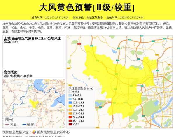 杭州市余杭区气象台2022年7月27日17时39分发布大风黄色预警信号:受强对流云团影响,预计今天傍晚到前半夜我区百丈、鸬鸟、黄湖、径山、余杭、中泰、仓前、五常、瓶窑、闲林、良渚等镇、街道将出现7-9级雷雨大风,请注意防范大风对户外广告牌、设施农业、在建工程等的不利影响。 信息来源:国家预警信息发布中心; 发布单位:余杭区气象台。