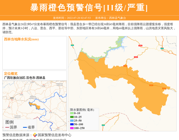 西林县气象台发布暴雨橙色预警信号[II级/严重] 相关文章