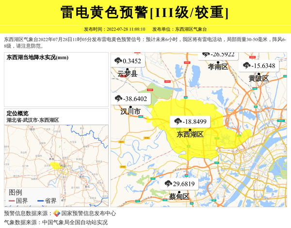 东西湖区气象台2022年07月28日11时05分发布雷电黄色预警信号:预计未来6小时,我区将有雷电活动,局部雨量30-50毫米,阵风6-8级,请注意防范。 信息来源:国家预警信息发布中心; 发布单位:东西湖区气象台。