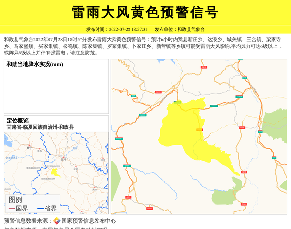 和政县气象台2022年07月28日18时57分发布雷雨大风黄色预警信号:预计6小时内我县新庄乡、达浪乡、城关镇、三合镇、梁家寺乡、马家堡镇、买家集镇、松鸣镇、陈家集镇、罗家集镇、卜家庄乡、新营镇等乡镇可能受雷雨大风影响,平均风力可达6级以上,或阵风8级以上并伴有强雷电,请注意防范。 信息来源:国家预警信息发布中心; 发布单位:和政县气象台。