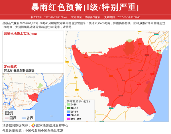 昌黎县气象台2022年07月29日00时40分继续发布暴雨红色预警信号:预计未来6小时内,降雨仍将持续,团林乡累计降雨量将超过150毫米,大蒲河镇累计降雨量将超过200毫米,请防范。 信息来源:国家预警信息发布中心; 发布单位:昌黎县气象台。