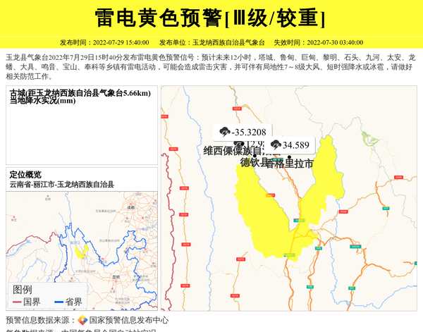 玉龙纳西族自治县气象台发布雷电黄色预警[Ⅲ级/较重] 相关文章