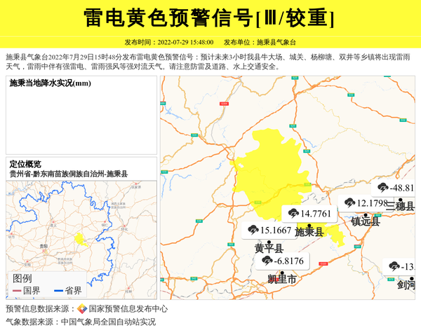 施秉县气象台2022年7月29日15时48分发布雷电黄色预警信号:预计未来3小时我县牛大场、城关、杨柳塘、双井等乡镇将出现雷雨天气,雷雨中伴有强雷电、雷雨强风等强对流天气。请注意防雷及道路、水上交通安全。 信息来源:国家预警信息发布中心; 发布单位:施秉县气象台。