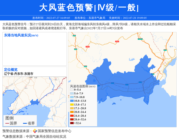 大风蓝色预警信号:预计27日夜间到28日白天,黄海北部海域偏东风转东南风6级,阵风7到8级,请相关水域水上作业和过往船舶采取积极的应对措施,如回港避风或者绕道航行等。东港市气象台2022年7月27日16时5分发布 信息来源:国家预警信息发布中心; 发布单位:东港市气象局。