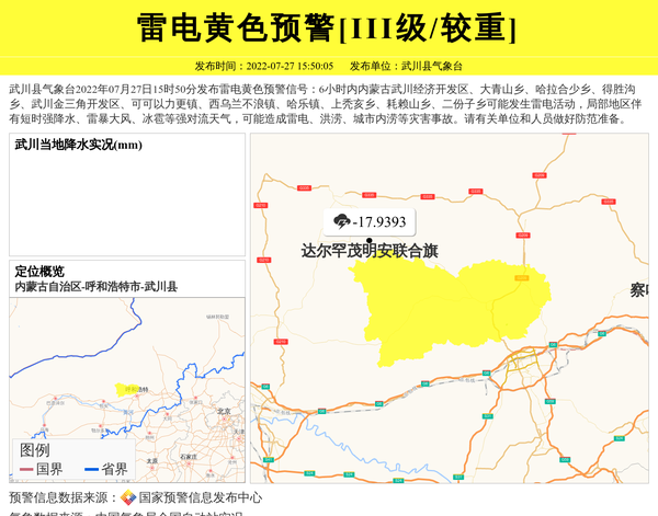 武川县气象台2022年07月27日15时50分发布雷电黄色预警信号:6小时内内蒙古武川经济开发区、大青山乡、哈拉合少乡、得胜沟乡、武川金三角开发区、可可以力更镇、西乌兰不浪镇、哈乐镇、上秃亥乡、耗赖山乡、二份子乡可能发生雷电活动,局部地区伴有短时强降水、雷暴大风、冰雹等强对流天气,可能造成雷电、洪涝、城市内涝等灾害事故。请有关单位和人员做好防范准备。 信息来源:国家预警信息发布中心; 发布单位:武川县气象台。