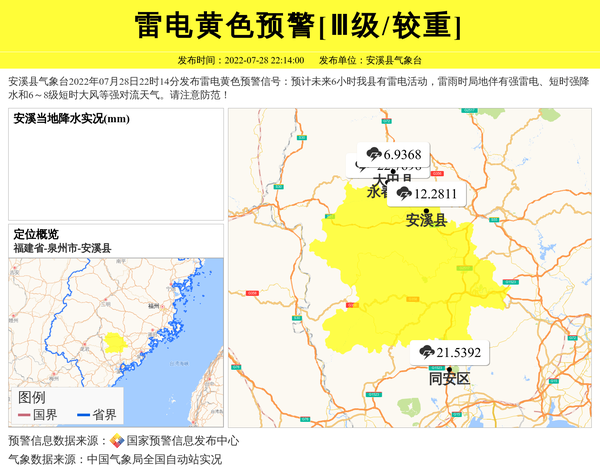 安溪县气象台2022年07月28日22时14分发布雷电黄色预警信号:预计未来6小时我县有雷电活动,雷雨时局地伴有强雷电、短时强降水和6~8级短时大风等强对流天气。请注意防范! 信息来源:国家预警信息发布中心; 发布单位:安溪县气象台。