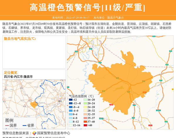 隆昌市气象台2022年07月29日09时50分发布高温橙色预警信号:预计我市古湖街道、金鹅街道、普润镇、云顶镇、胡家镇、石燕桥镇、石碾镇、界市镇、龙市镇、双凤镇、黄家镇、圣灯镇、响石镇等镇(街道)未来24小时内最高气温将升至38℃以上。请做好防暑降温工作,注意防火,保障电力和公共卫生安全;高温环境和露天作业人员应采取防暑降温措施。 信息来源:国家预警信息发布中心; 发布单位:隆昌市气象台。
