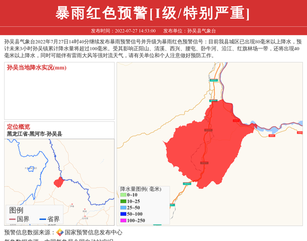 孙吴县气象台2022年7月27日14时40分继续发布暴雨预警信号并升级为暴雨红色预警信号:目前我县城区已出现80毫米以上降水,预计未来3小时孙吴镇累计降水量将超过100毫米。受其影响正阳山、清溪、西兴、腰屯、卧牛河、沿江、红旗林场一带,还将出现40毫米以上降水,同时可能伴有雷雨大风等强对流天气,请有关单位和个人注意做好预防工作。 信息来源:国家预警信息发布中心; 发布单位:孙吴县气象台。