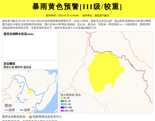 逊克县气象台2022年7月29日15时40分发布暴雨黄色预警信号:过去3小时内,我县宝山乡宝山村、福山村及克林镇台山村累计降雨量已超过45毫米,目前降雨仍在持续,预计未来6小时我县克林镇、宝山乡、新兴乡、车陆乡一带还将有10~25毫米降水,降雨同时局地还将伴有雷雨大风、冰雹等强对流天气,请有关单位和个人注意做好预防工作。 信息来源:国家预警信息发布中心; 发布单位:逊克县气象台。