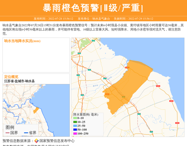 响水县气象台发布暴雨橙色预警[Ⅱ级/严重]