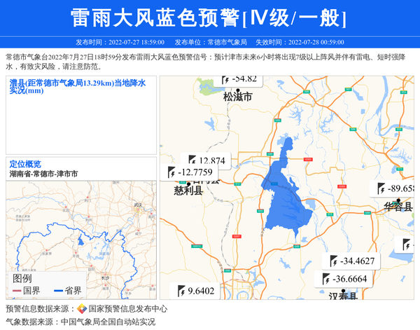 常德市气象台2022年7月27日18时59分发布雷雨大风蓝色预警信号:预计津市未来6小时将出现7级以上阵风并伴有雷电、短时强降水,有致灾风险,请注意防范。 信息来源:国家预警信息发布中心; 发布单位:常德市气象局。