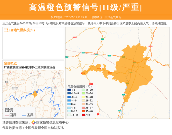 三江县气象台2022年7月28日10时19分继续发布高温橙色预警信号:预计今天中下午我县将出现37度以上的高温天气,请做好防范。 信息来源:国家预警信息发布中心; 发布单位:三江县气象台。
