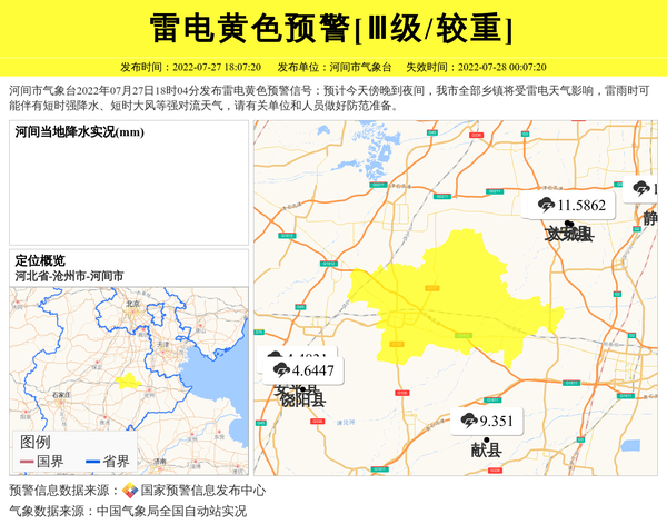 河间市气象台2022年07月27日18时04分发布雷电黄色预警信号:预计今天傍晚到夜间,我市全部乡镇将受雷电天气影响,雷雨时可能伴有短时强降水、短时大风等强对流天气,请有关单位和人员做好防范准备。 信息来源:国家预警信息发布中心; 发布单位:河间市气象台。