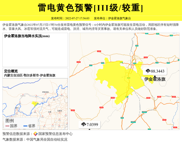 伊金霍洛旗气象台2022年07月27日17时54分发布雷电黄色预警信号:6小时内伊金霍洛旗可能发生雷电活动,局部地区伴有短时强降水、雷暴大风、冰雹等强对流天气,可能造成雷电、洪涝、城市内涝等灾害事故。请有关单位和人员做好防范准备。 信息来源:国家预警信息发布中心; 发布单位:伊金霍洛旗气象台。