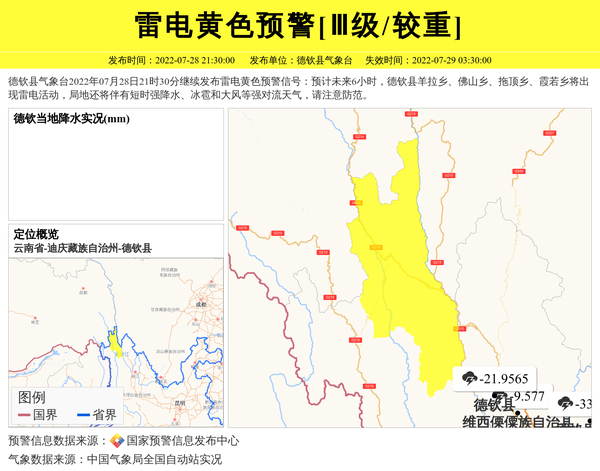 德钦县气象台2022年07月28日21时30分继续发布雷电黄色预警信号:预计未来6小时,德钦县羊拉乡、佛山乡、拖顶乡、霞若乡将出现雷电活动,局地还将伴有短时强降水、冰雹和大风等强对流天气,请注意防范。 信息来源:国家预警信息发布中心; 发布单位:德钦县气象台。