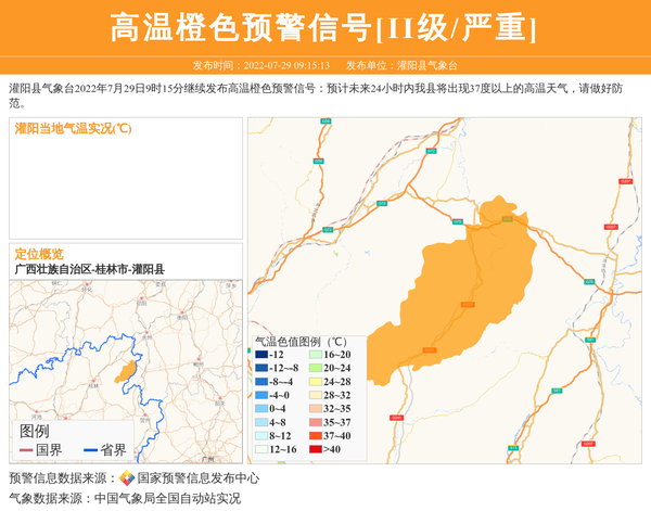 灌阳县气象台2022年7月29日9时15分继续发布高温橙色预警信号:预计未来24小时内我县将出现37度以上的高温天气,请做好防范。 信息来源:国家预警信息发布中心; 发布单位:灌阳县气象台。